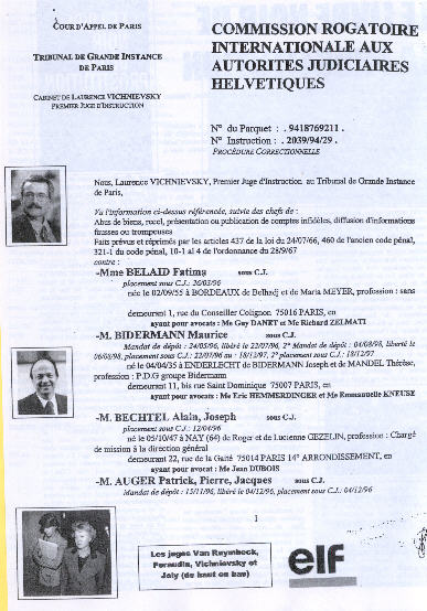Ils sont 37 � �tre mis en examen (inculp�s) dans l'affaire " Elf " proprement dite. 37 noms avec tous les d�tails qui s'y rapportent contenus dans un document judiciaire �manant de la Cour d'Appel de Paris et plus pr�cis�ment pour le document dont reproduction de la premi�re page en fac simil� ci contre du cabinet du juge d'instruction Laurence Vichnievsky, associ�e dans le fameux pool financier du boulevard des Italiens � Paris � Eva Joly et Renaud Van Ruymbeck. Pour la premi�re fois dans un organe de presse, la liste de tous les inculp�s, avec leur statut judiciaire (Libre, sous contr�le judiciaire = C.J. ou sous mandat d'arr�t ou mandat de d�p�t), leur �tat civil, profession, adresse et avocat(s). Tous sont mis en examen pour les motifs de " abus de bien, recel, pr�sentation ou publication de comptes infid�les, diffusion d'informations fausses ou trompeuses ". Un document exceptionnel !