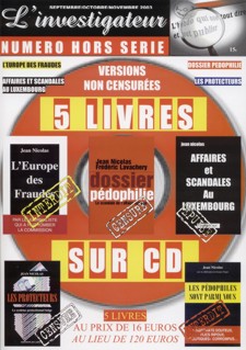 Au menu de ce deuxi�me num�ro hors s�rie, cinq livres d�enqu�te, tous �crits par Jean Nicolas, dont � Affaires et Scandales au Luxembourg �, �puis�, � Dossier P�dophilie �, le livre qui a mis en cause Albert II et qui n�est plus en vente, � Les Protecteurs � sur les affaires de p�dophilie en Belgique, � L�Europe des Fraudes �, interdit en Belgique, sur la chute de la Commission Santer et l�affaire Cresson et � Les P�dophiles sont parmi nous �, dont la saisie fut refus�e par la justice.